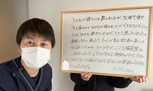 リラックスした施術の中で、本当に約3ヶ月後に妊娠がわかり、先生には感謝の気持ちでいっぱいです!